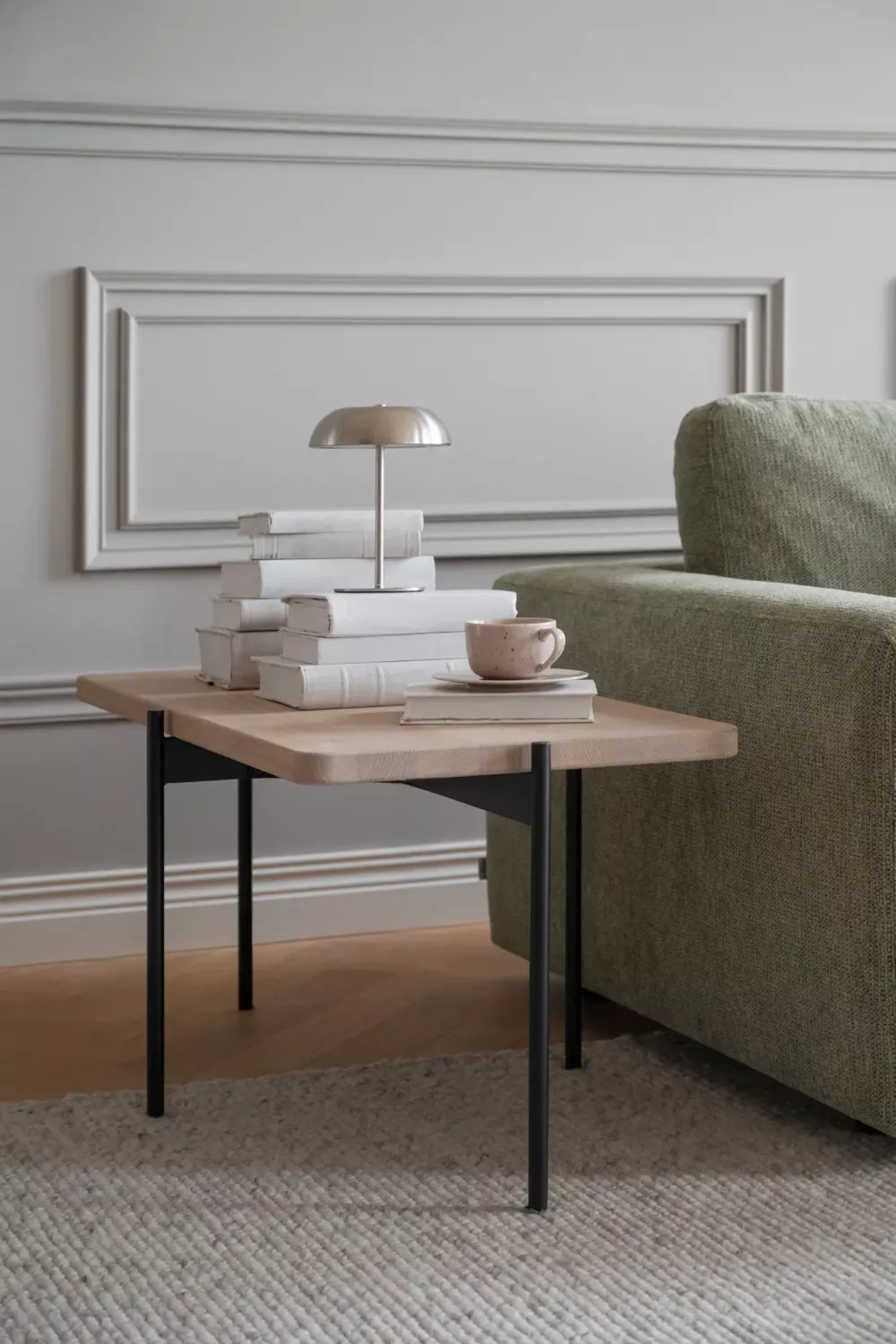 Material: Massiv Europeisk ek, hela lameller, 30mm tjocklek. Pulverlackad metall i sandstruktur på ben.