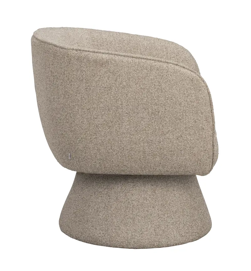 Den skulpterade sitsen erbjuder en naturligt omslutande känsla och ger ett behagligt stöd, vilket gör stolen lika skön att sitta i som den är vacker att se på. Det stadiga underredet med snurrfunktion förstärker helhetsintrycket av stabilitet och kvalitet, samtidigt som det lyfter fram de mjuka formerna och ger möbeln ett välbalanserat uttryck.