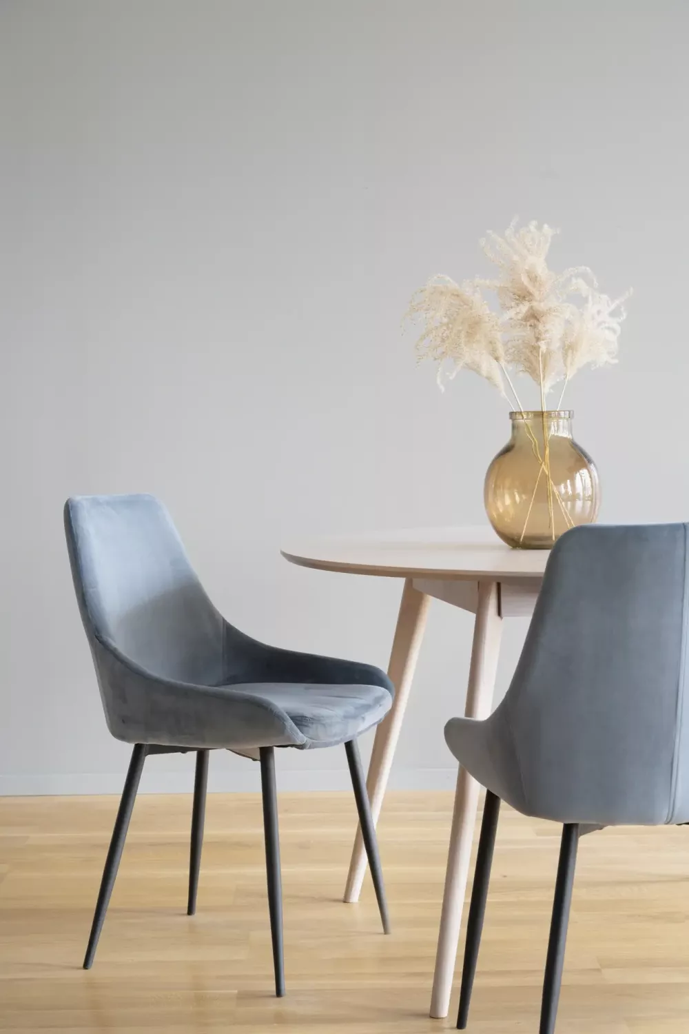 Material: Klädd stol i sammetstyg med hög slitagenivå, metallben i svart pulverlack.