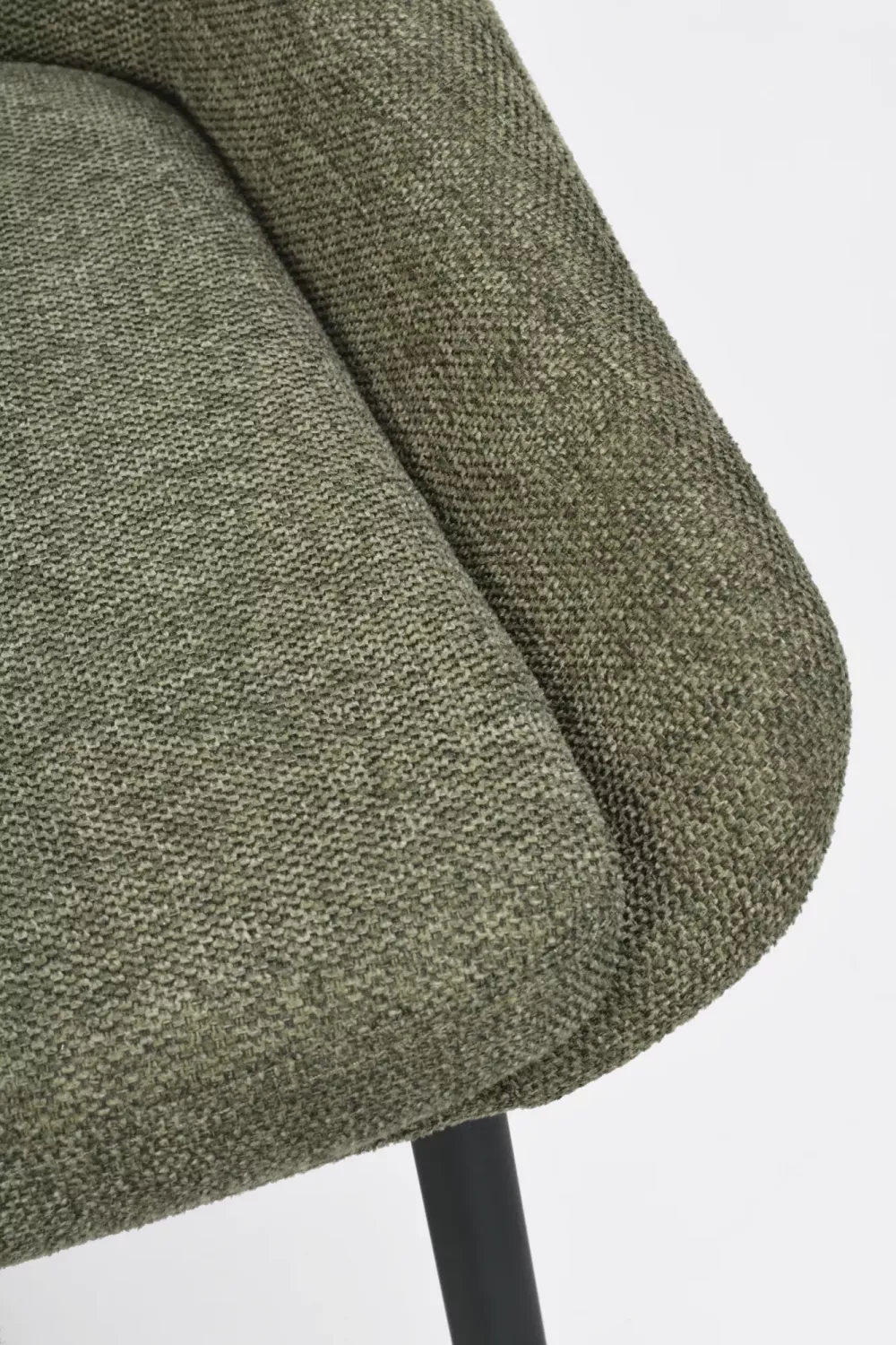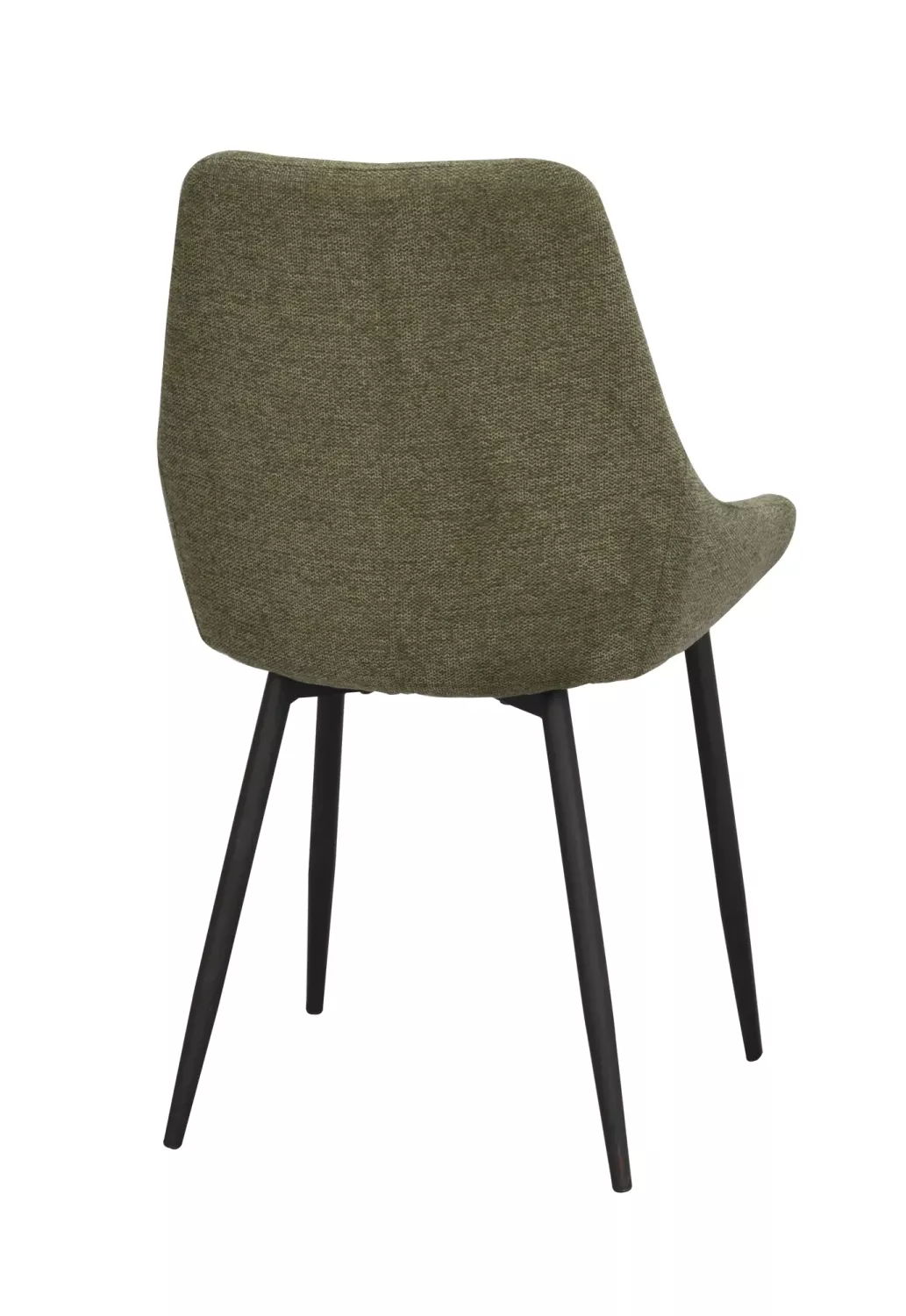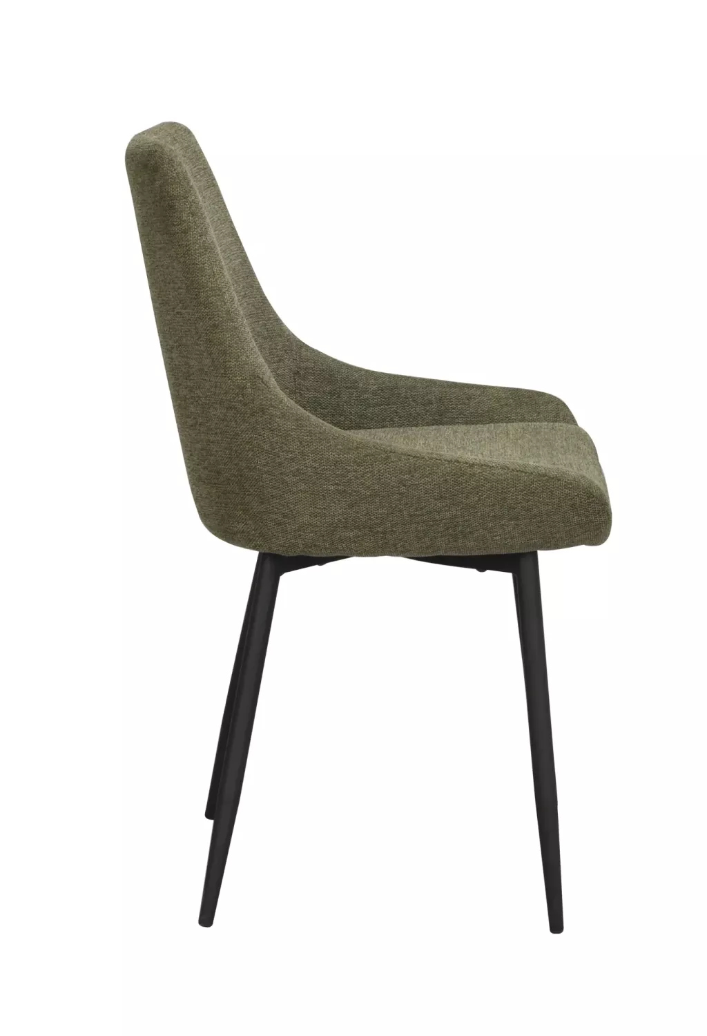 Här syns den med sits i grönt polyestertyg, tyget har hög slitagenivå och stolen har tåliga ben i svart pulverlackad metall.