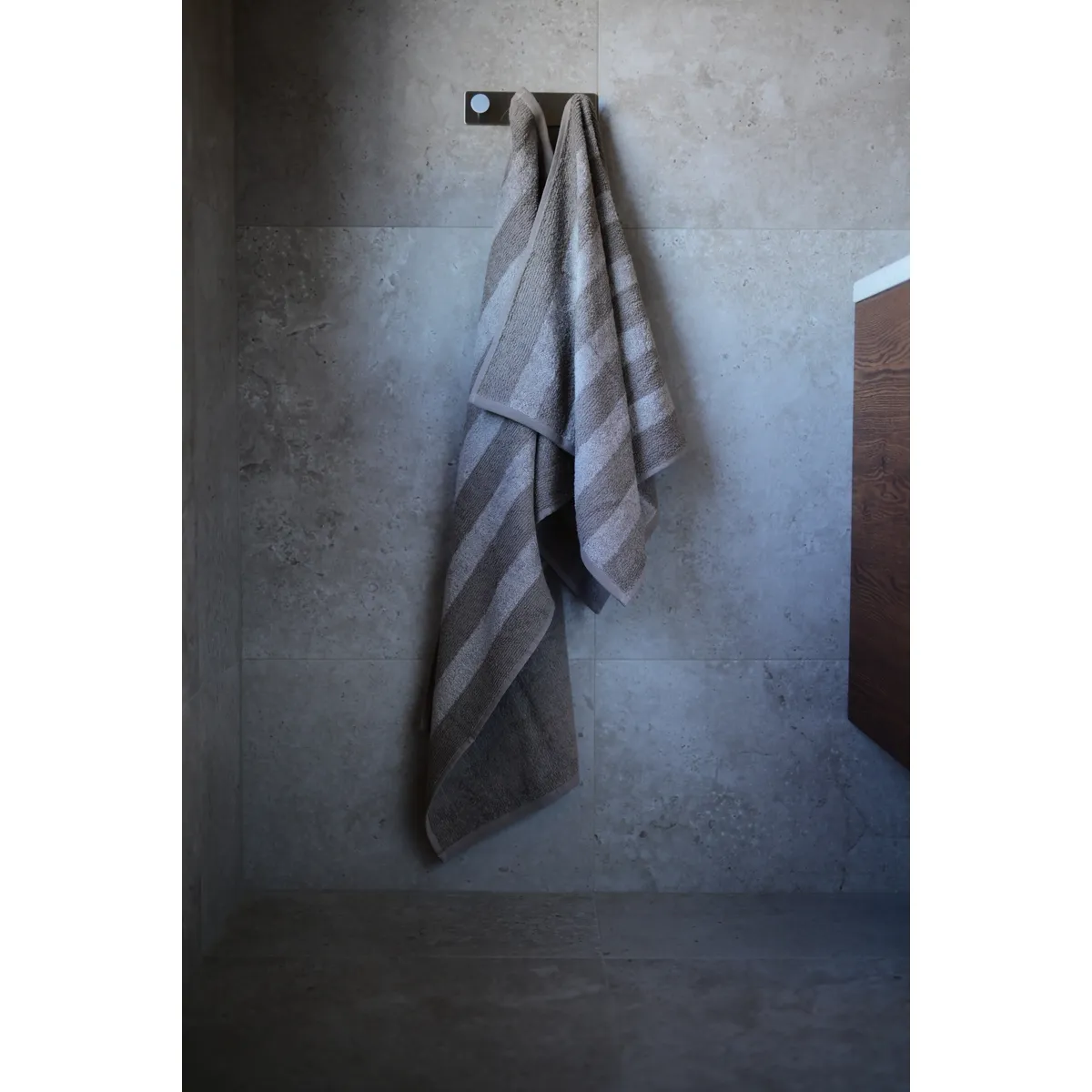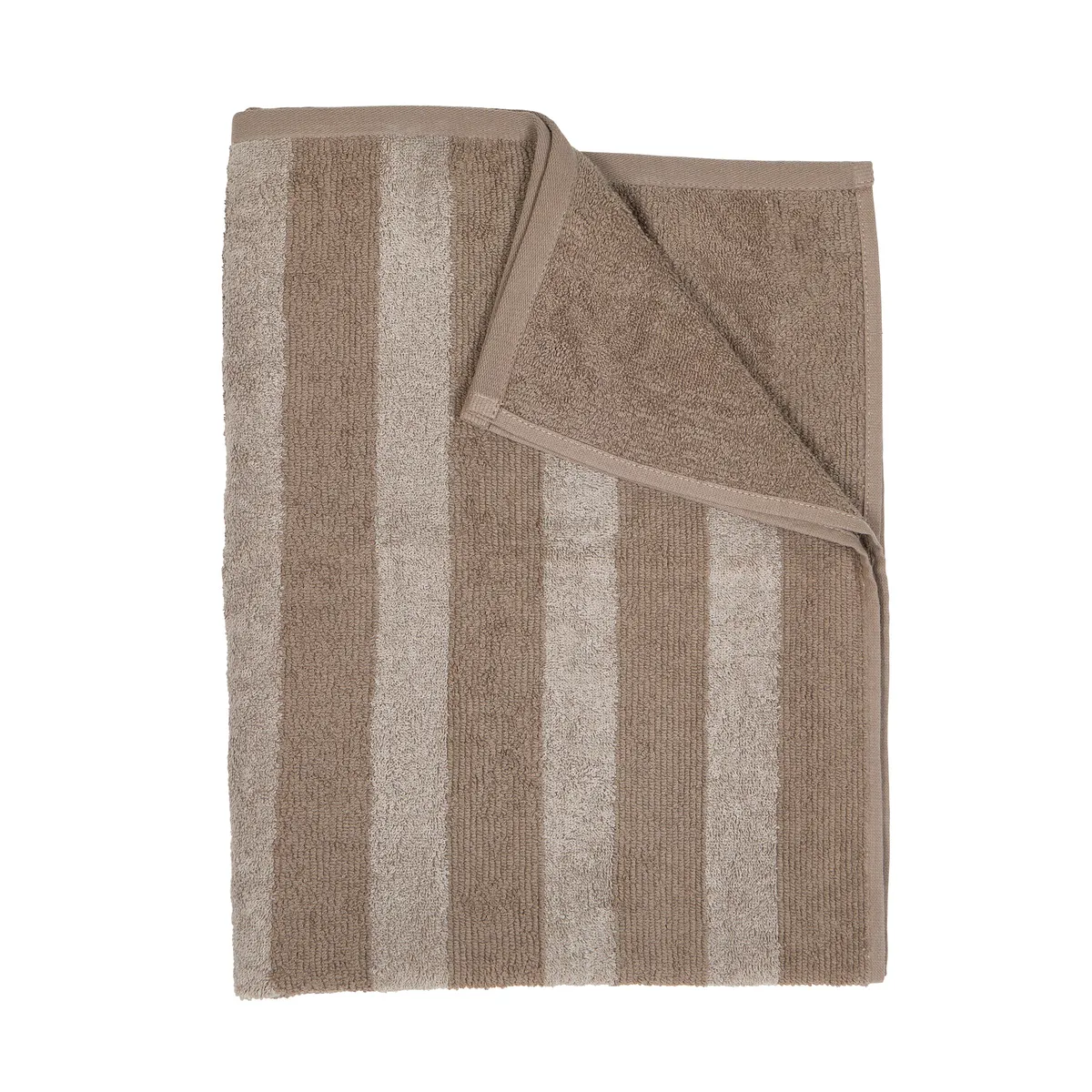 Frottéhandduk tillverkad av en blandning av bomull och polyester, där materialkombinationen skapar en vacker randig effekt på framsidan under färgningen. Eftersom bomull och polyester absorberar färgämne på olika sätt framträder ett naturligt randigt mönster, vilket ger handduken ett unikt utseende. Baksidan är enfärgad, vilket skapar en fin kontrast till den livfulla framsidan.
