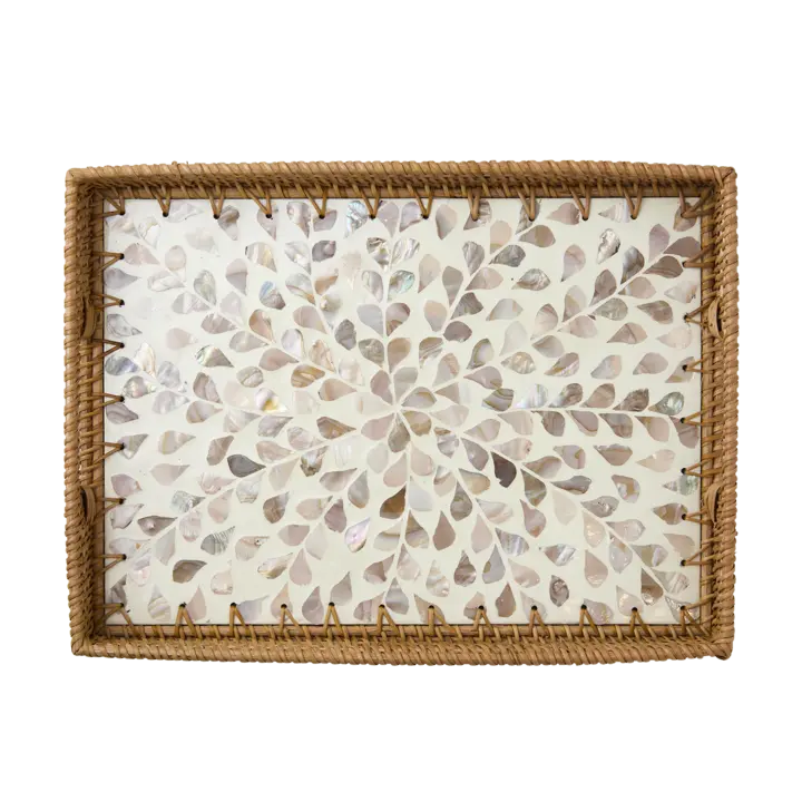Vacker handgjord bricka i rotting med mdf och odlade snäckor i ett fint skimrande mönster. En perfekt bricka att få frukosten serverad i sängen.