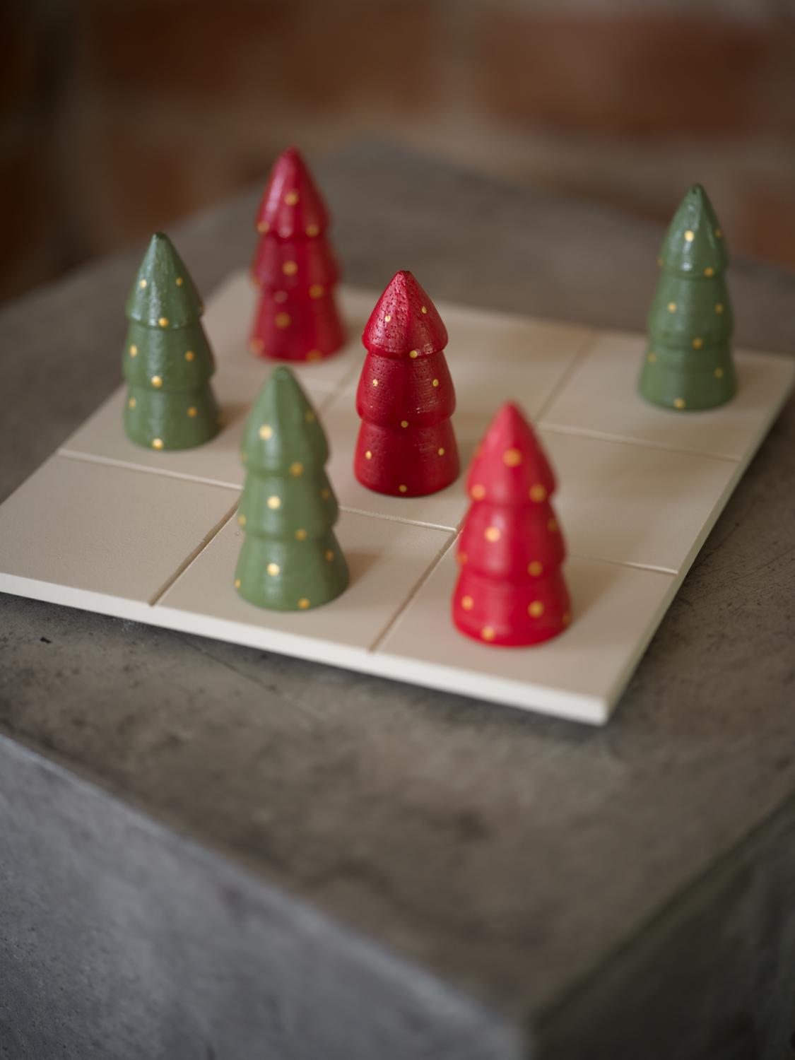 Häftigt tre i rad spel i trä med sandfärgad spelplan och granar i rött och grönt. Detta är även en superfin present att ge bort till den som har allt då det med fördel kan stå framme och locka till roliga spelkvällar.
