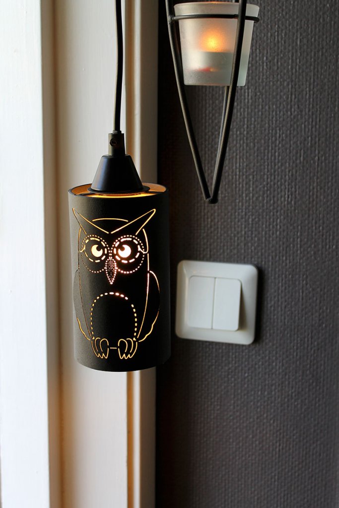 Läcker fönster lampa i svart metall med utstansad uggla.