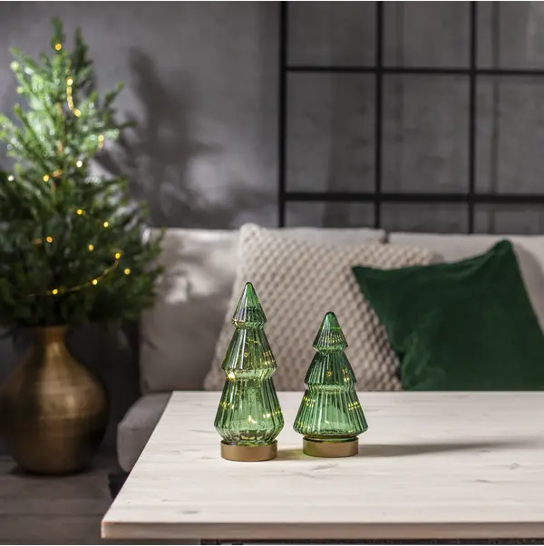 Snygg batteridriven bordsdekoration i form av en gran i transparent mörkt grönt glas. Guldfärgad bas som gömmer batteriboxen. Drivs av 3 st AAA batterier. Ger ett vackert sken som dekoration på tex julbordet.
