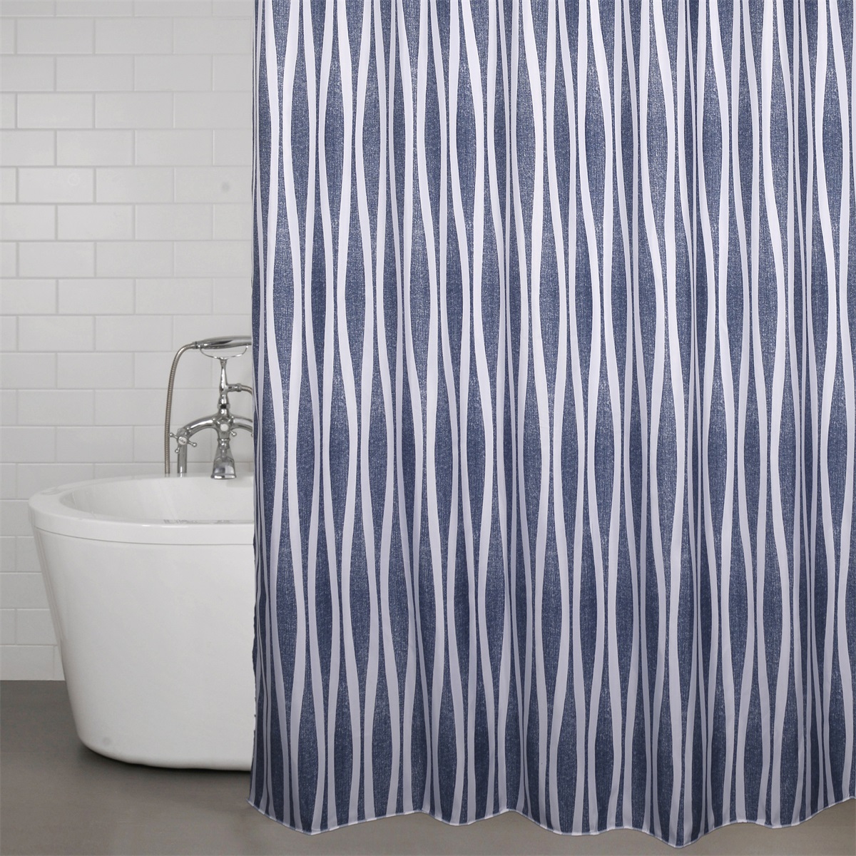 Duschdraperi med vågigt mönster. Inkl 12 st vita ringar för enkel upphängning. Mönster skapat av svensk designer.
