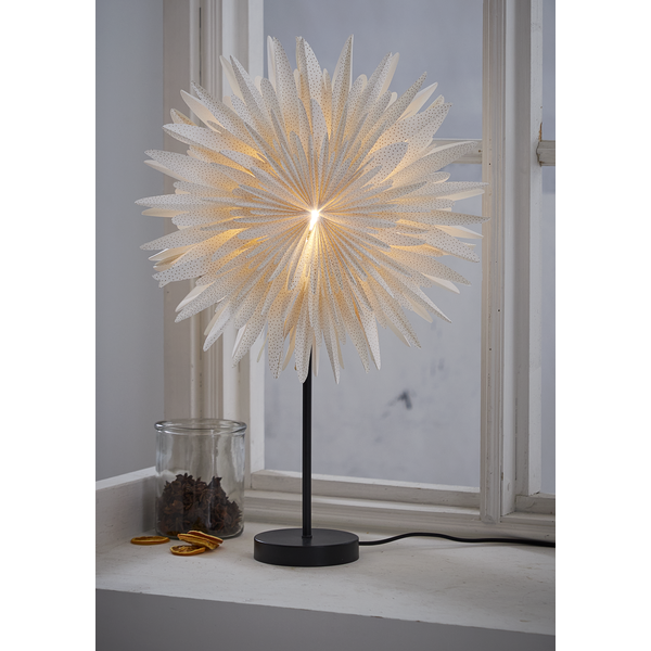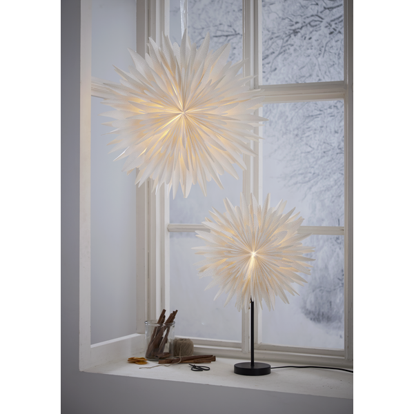 Fantastisk vit pappersstjärna på svart fot . Stjärnan är tillverkad av tre lager veckat papper. Konturen har runda flickar som gör att stjärnan ser busigt vintrig ut. Adventsstjärnan på fot skapar en perkeft julstämning och ger hemmet den där speciella julkänslan. Kan placeras både i förnster och på en skänk.